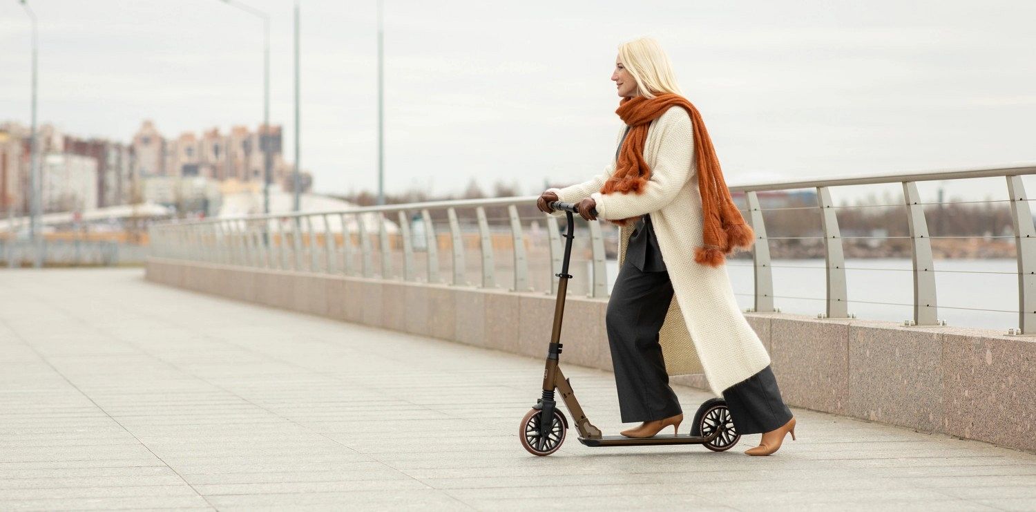 Shulz 200 Pro – это самый устойчивый и проходимый складной самокат, идеально подходящий для длительных поездок. Его просторная дека позволяет комфортно разместить обе ступни, а эргономичный руль с регулировкой по высоте, изогнутым выносом и ребристыми грипсами обеспечивает удобное положение рук.