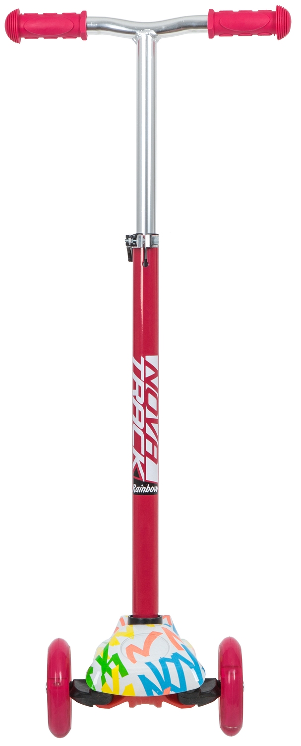 Самокат-кикборд Novatrack RainBow - это яркий детский самокат с износостойкими полиуретановыми колесами. Два колеса спереди и специальный поворотный механизм руля делают этот самокат очень устойчивым и безопасным, позволяя одинаково уверенно чувствовать себя ездокам с разным уровнем подготовки. Руль имеет регулировку по высоте, так что вам не придется через год покупать новый самокат.