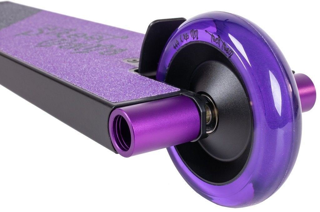 Колеса на алюминиевых дисках жесткостью 88A, диаметром 110 мм и шириной 26 мм выполнены из высококачественного SHR-полиуретана ("Super High Rebound" - сверх высокий отскок).