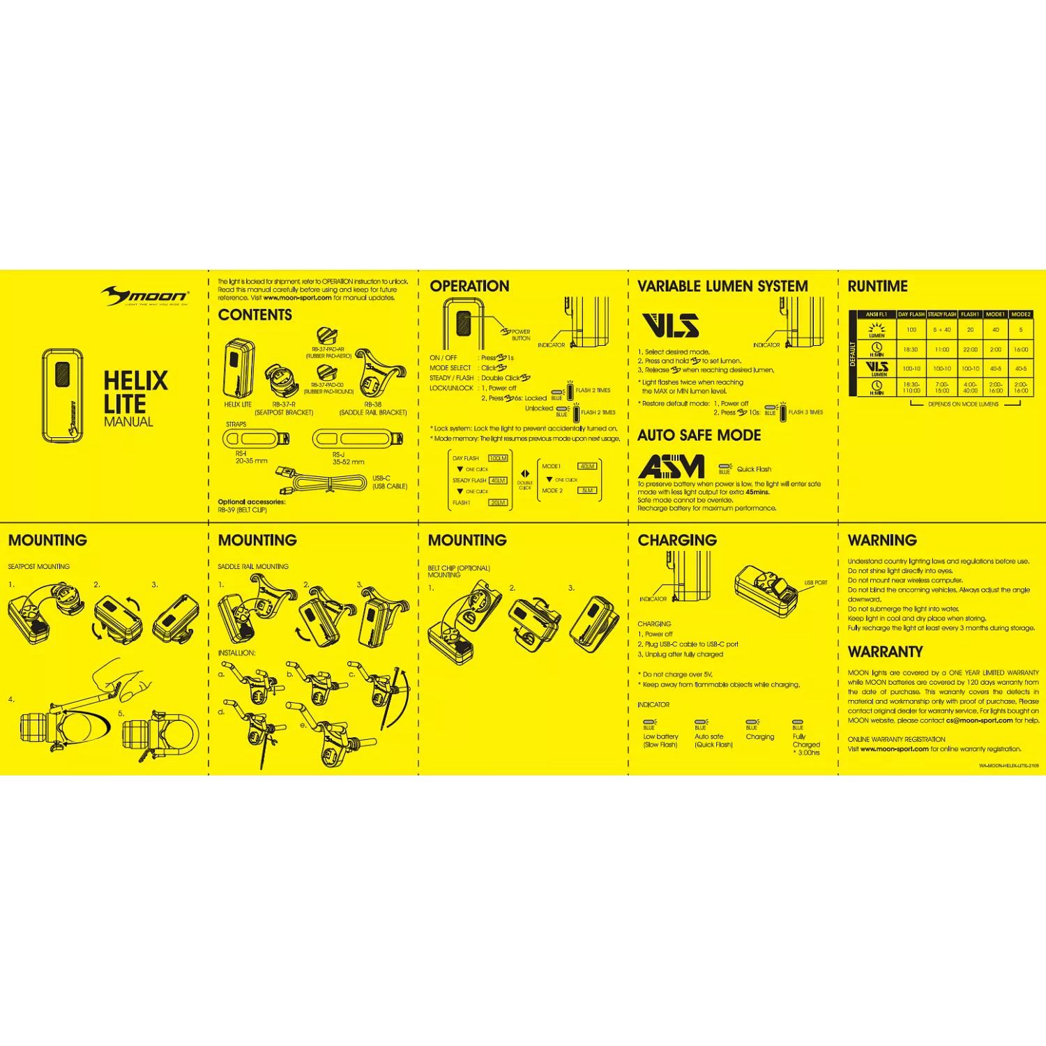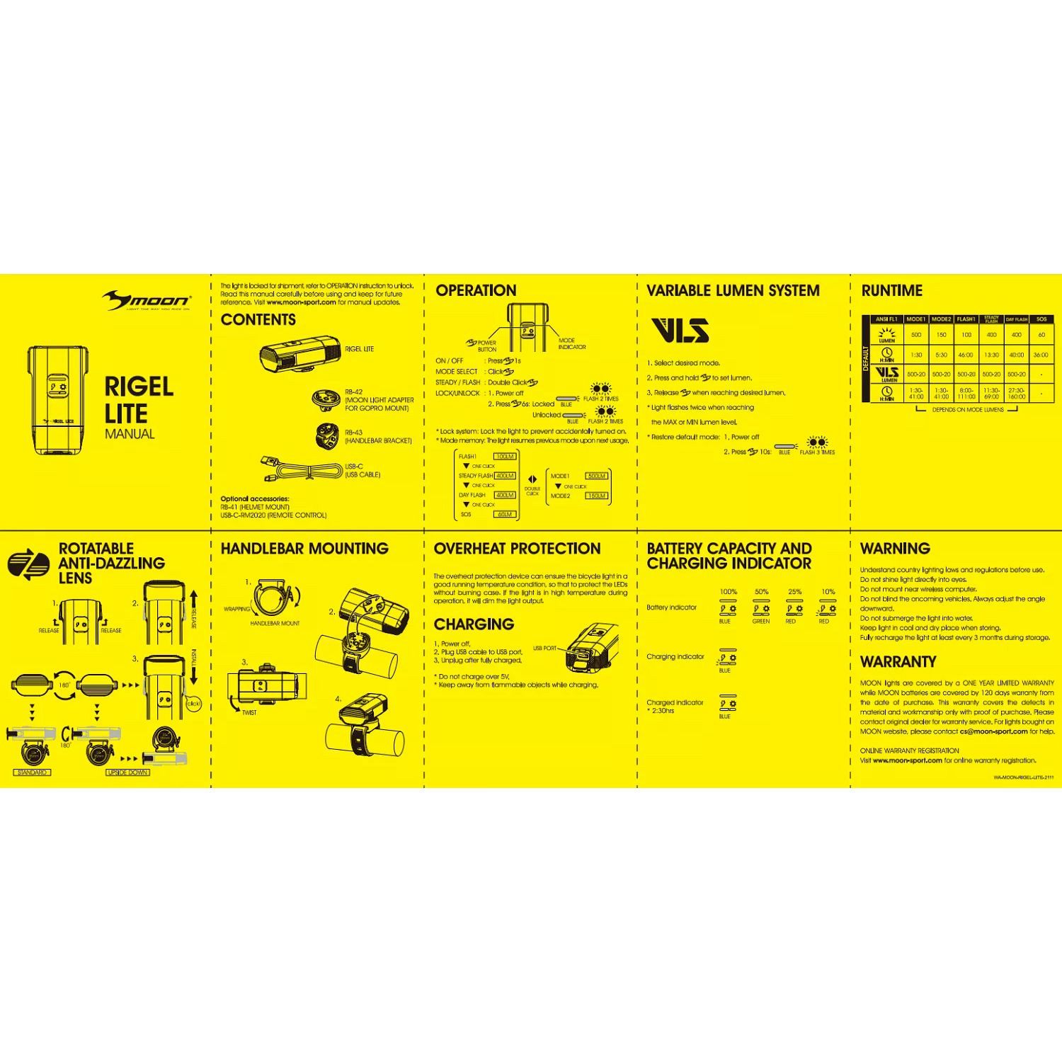 Комплект высококачественных фонарей Moon Rigel Lite 500 лм. + Moon Helix Lite 100 лм. выпущен в продажу ограниченной серией. Дальность освещения переднего фонаря свыше 50 метров, 6 режимов работы. Фонарь задний: 5 режимов работы. Литий-полимерные аккумуляторы 1200+300 mAh (Orion). Время автономной работы до 40 часов. Разъем для зарадного устройства: USB-C. 2 типа креплений в комплекте. Влагозащищённый корпус IPX 47. Вес фонарей без крепежа 96 гр.