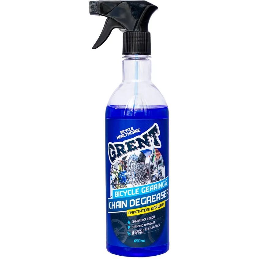 Очиститель для цепи и трансмиссии велосипеда Grent 650 мл. эффективно очищает цепи и элементы трансмиссии. Активные составляющие обеспечивают быстрое и глубокое очищение. Эффективно удаляет загрязнения: смазку, пыль, грязь и т.п. Применение: Нанести очиститель на детали трансмиссии и цепь. Оставить примерно на 5 минут, затем смыть теплой водой. При необходимости используйте специальные щётки и губки. Просушить и заново смазать цепь и детали трансмиссии. Регулярная очистка и смазка сокращают износ цепи и всех узлов трансмиссии.