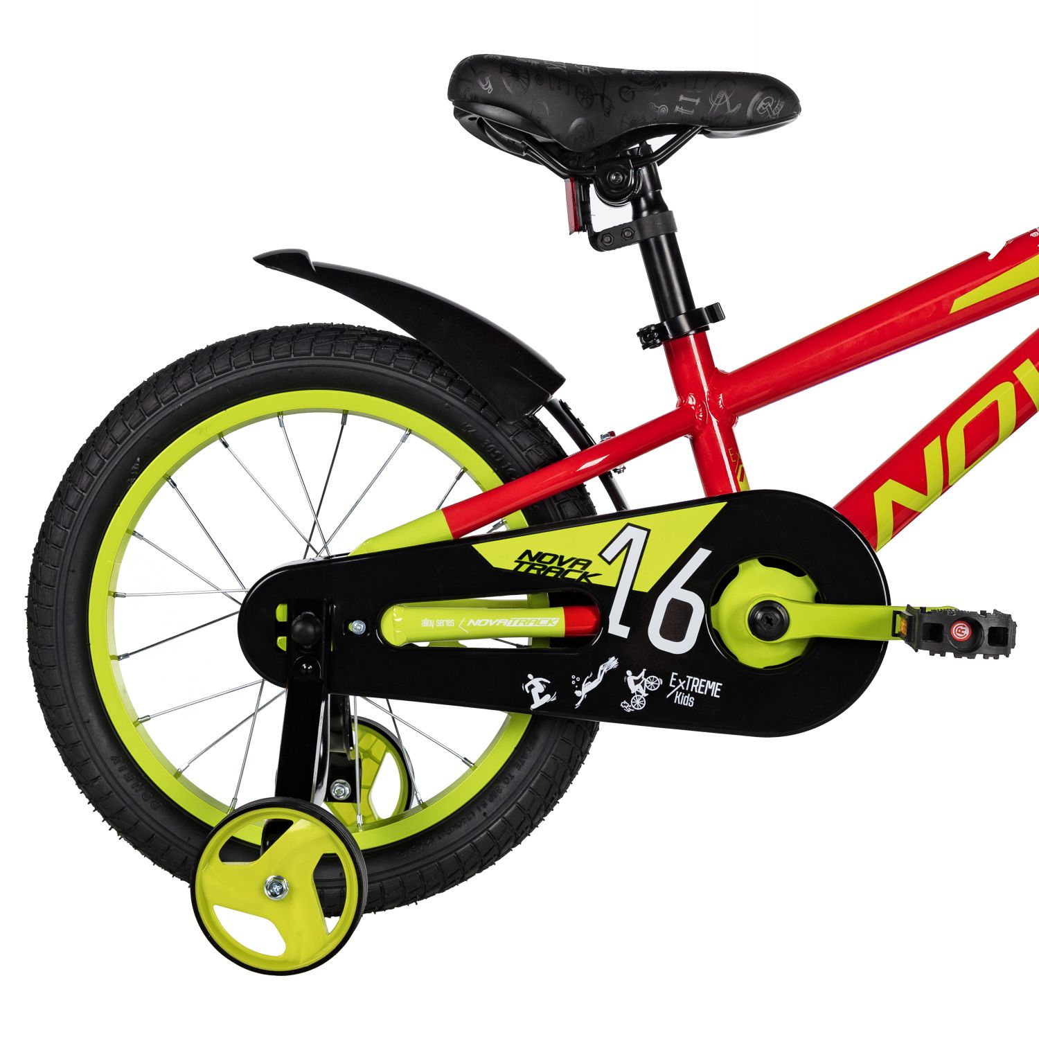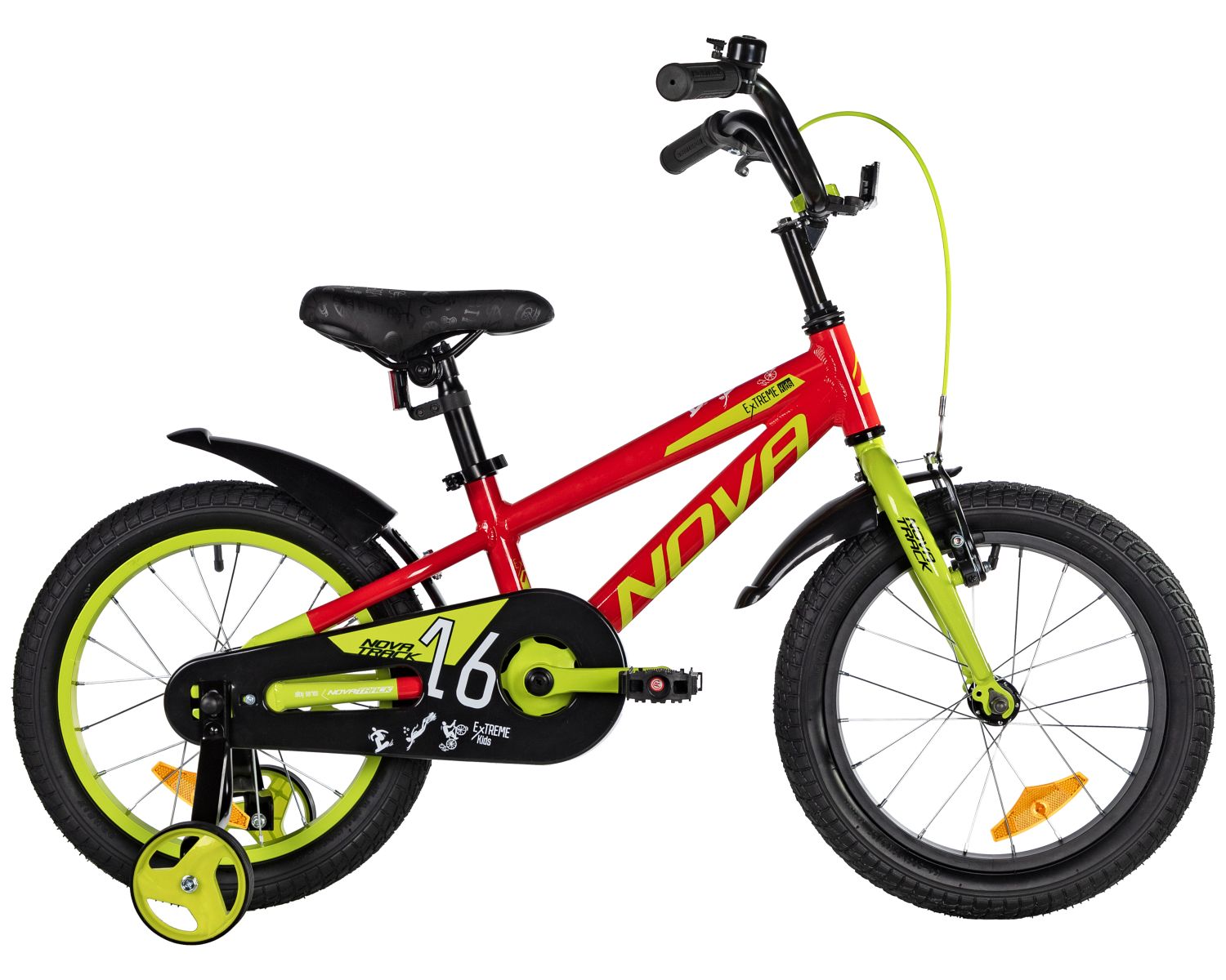 Велосипед Novatrack Extreme 1.V 16 также оснащён дополнительными боковыми колёсами, которые повышают устойчивость и помогают детям уверенно держаться на дороге. Полная защита цепи предотвращает попадание одежды и обуви в механизмы, а грязезащитные крылья защищают от брызг и грязи, делая каждую поездку более приятной и чистой.
