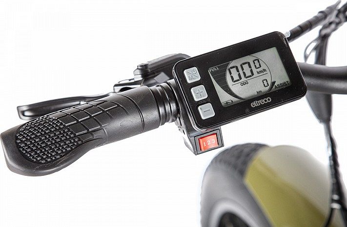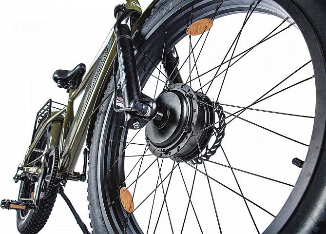 Отличная проходимость электро-фэтбайка обеспечивается благодаря большим колёсам 26х4.0" с широкими ободами, а также качественным покрышкам с глубоким протектором и увеличенным пятном контакта.