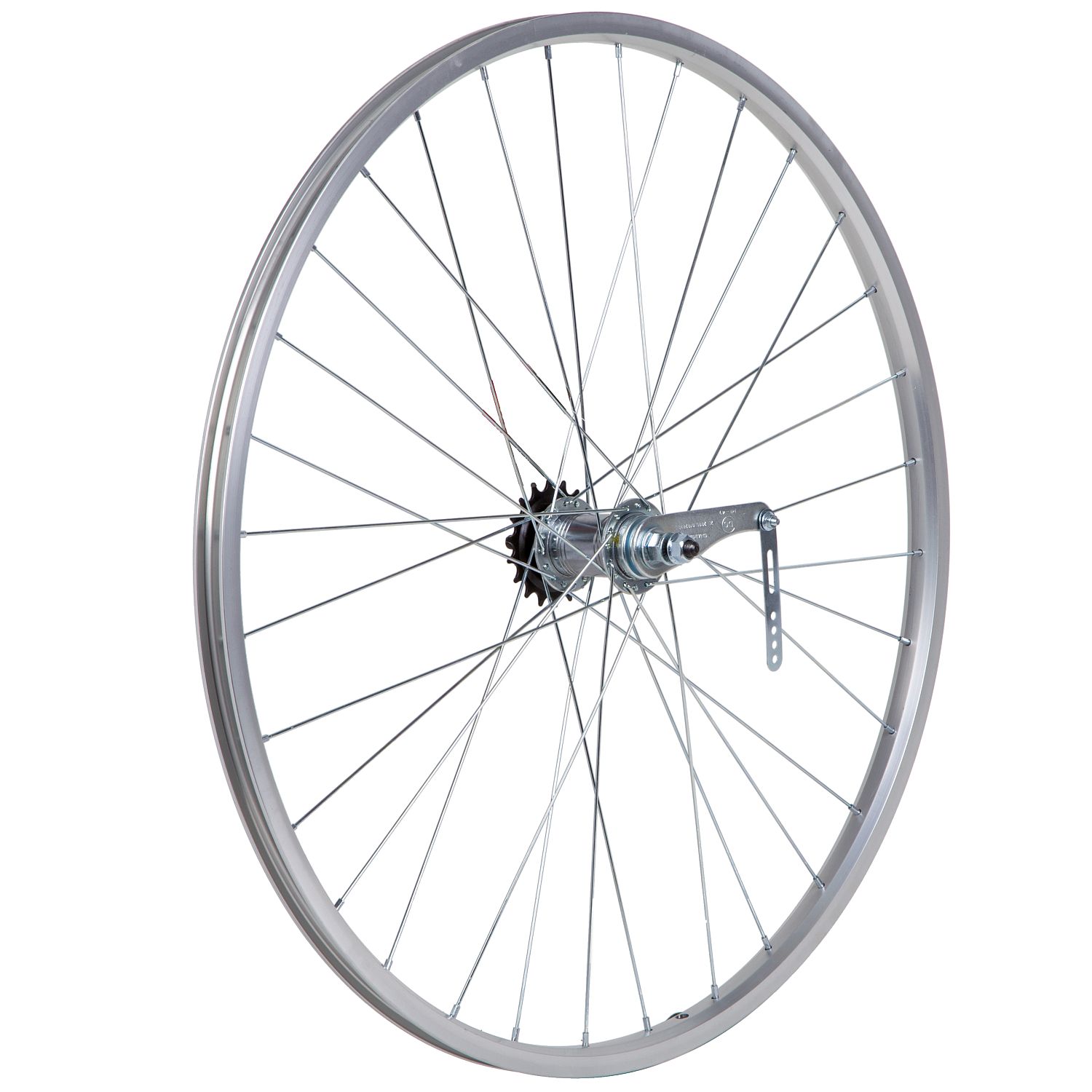Колесо 28 заднеебез резины. Одностенный алюминиевый обод на 32 спицы. Тормозная втулка сталь, ось на гайках.