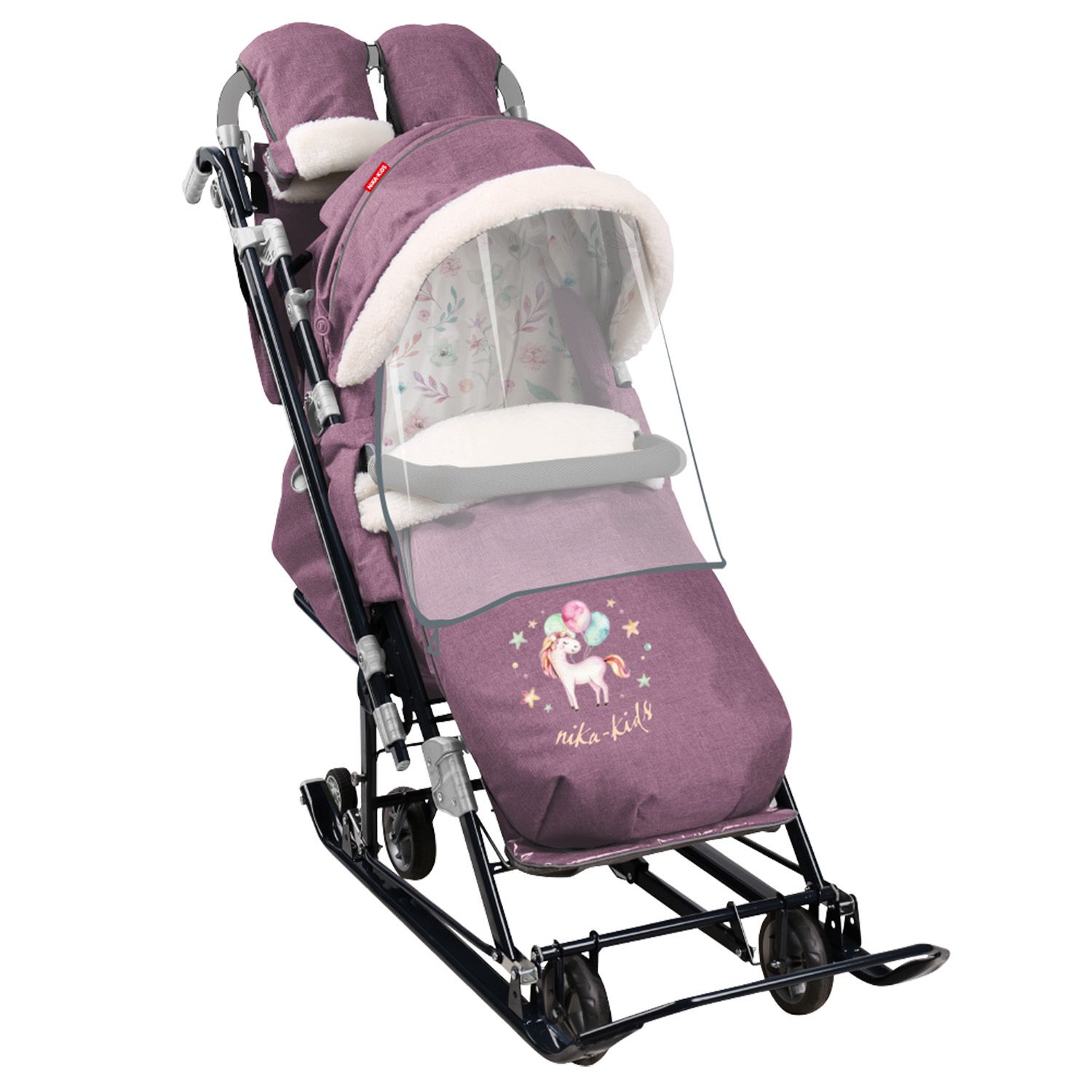 Санки-коляска комбинированная НИКА детям 7-8К, сиреневая с единорогом